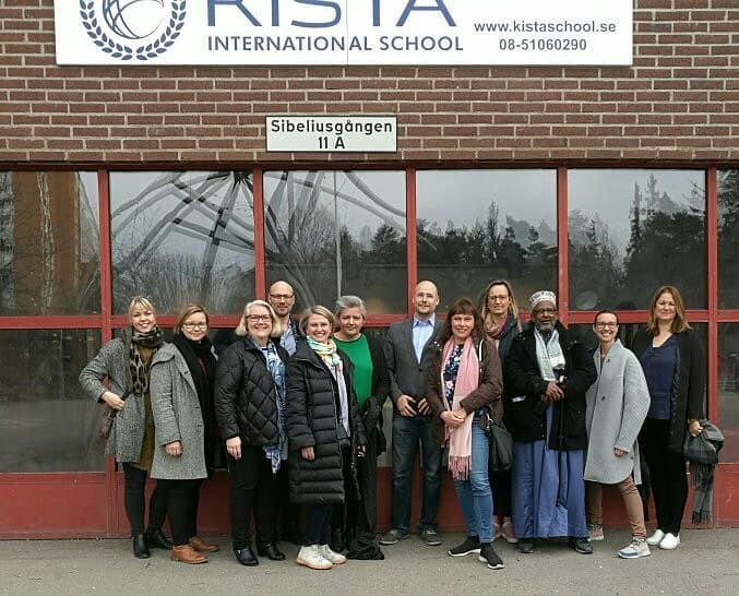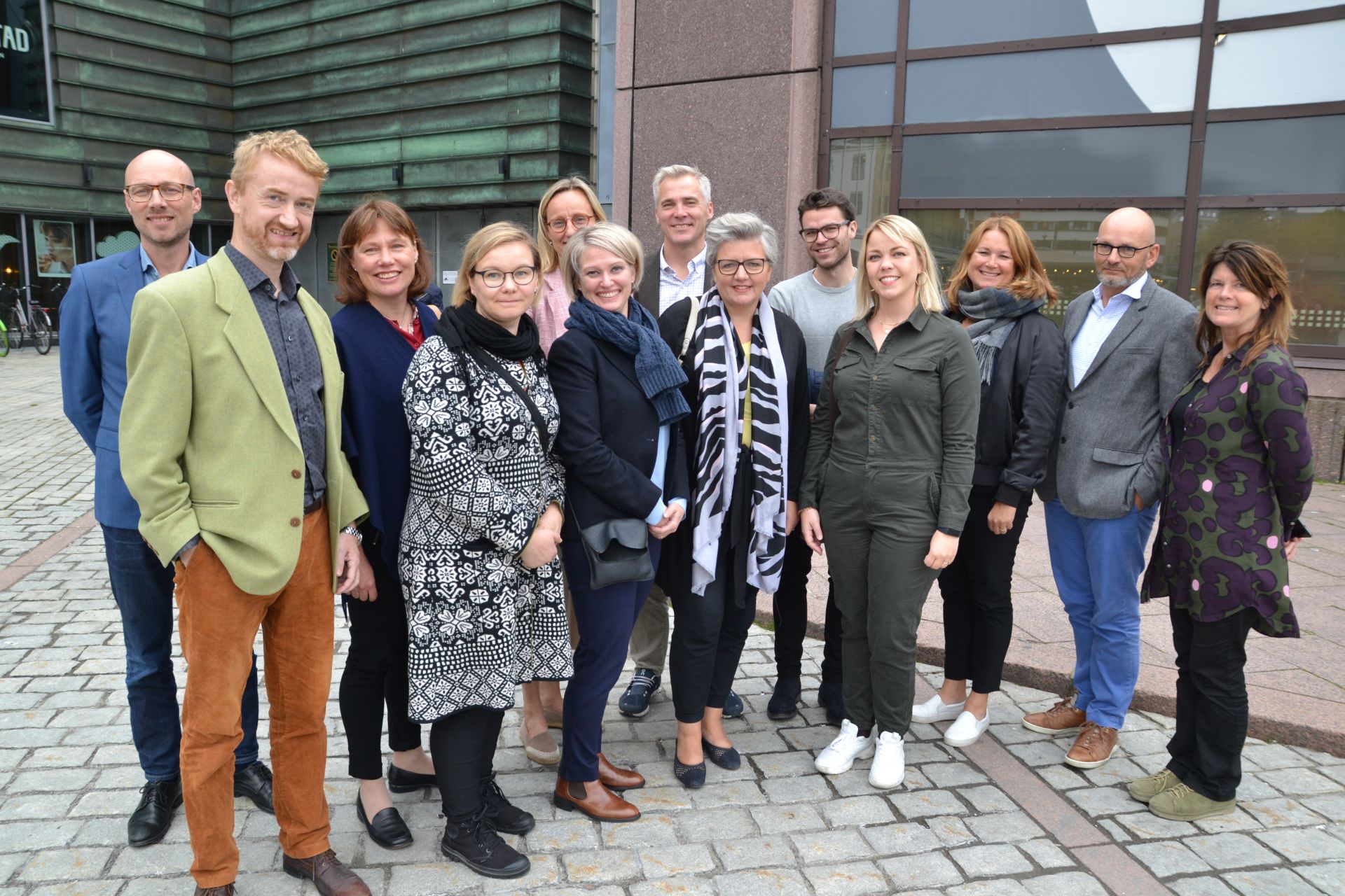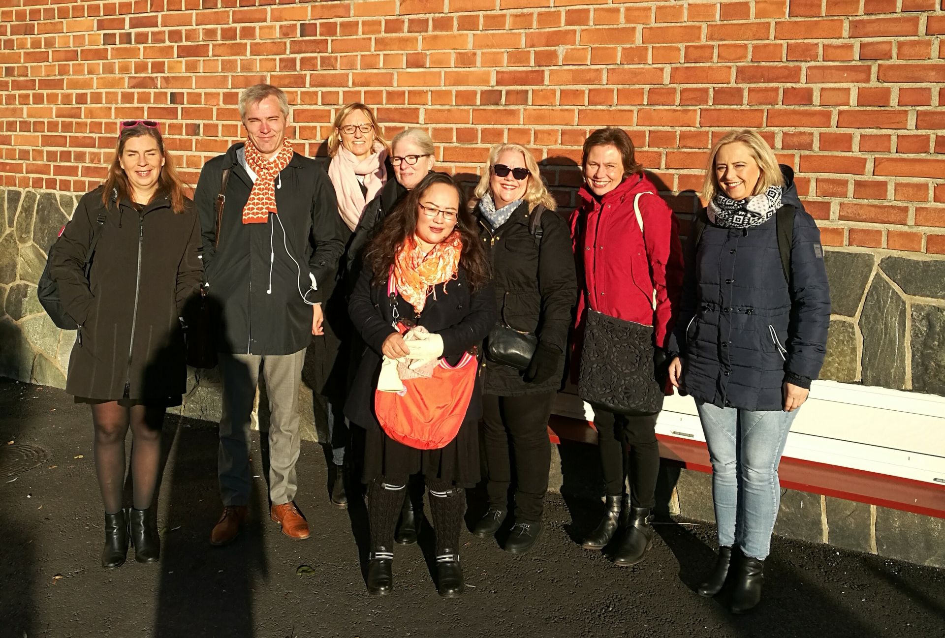 I solskenet utanför Hoplaxskolan i Helsingfors 30.10 2017. Från vänster: Mette With Hagensen, Anders Adlercreutz, Micaela Romantschuk, Gro Hexeberg Dahl, Sara Nergúi, Gunn Iren Müller, Maarit Westerén och Mildrid á Lógv.