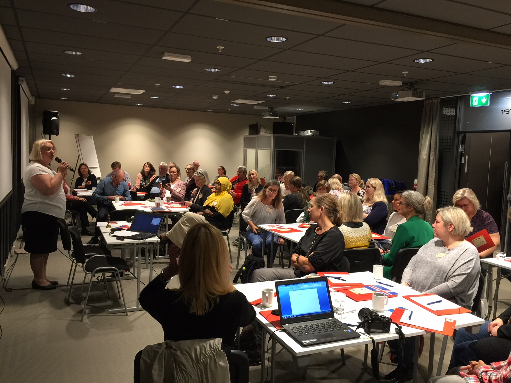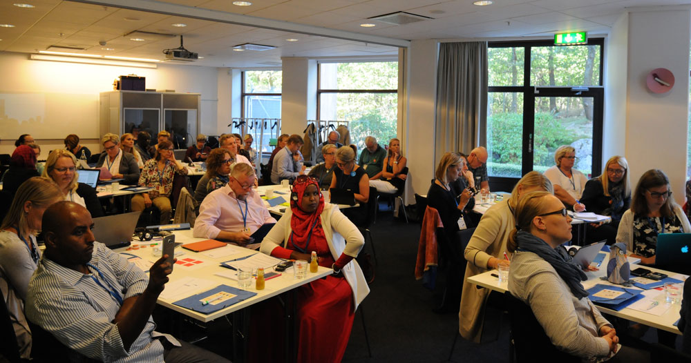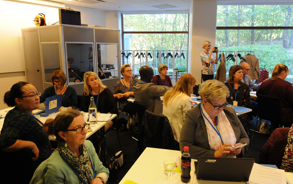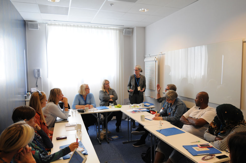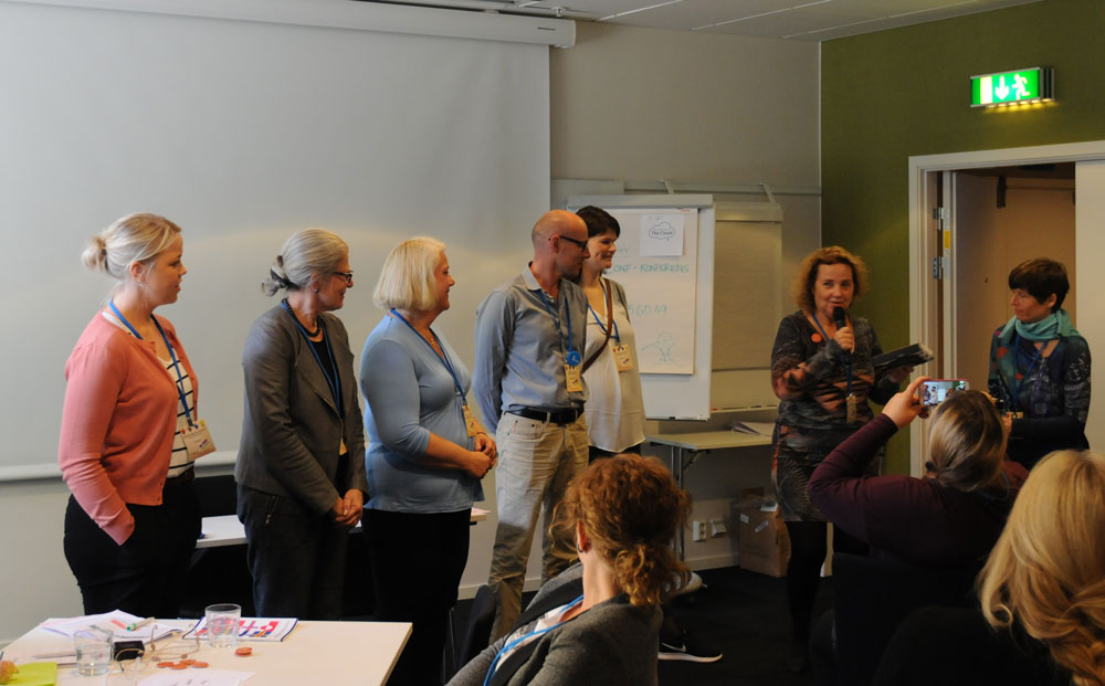 Noko-deltakerne, fra v: Morten Kruse og Rasmus Edelberg fra danske Skole og Forældre, Maarit Westerén, koordinator NoKo, Micaela Romantschuk og Anders Adlercreutz (bak) fra finske Hem och skola. I midten bak: foredragholder Mats A. Kirkebirkeland, Marianne Dahlseng, Ole Petter Østerbø og Torill Braaten fra FUG i Norge. Foran fra v. Ulla Siimes og Jenni Helenius fra den finskspråklige foreldreorganisasjonen og Sigrún Edda Eðvarðsdóttir og Hrefna Sigurjonsdóttir fra Island.