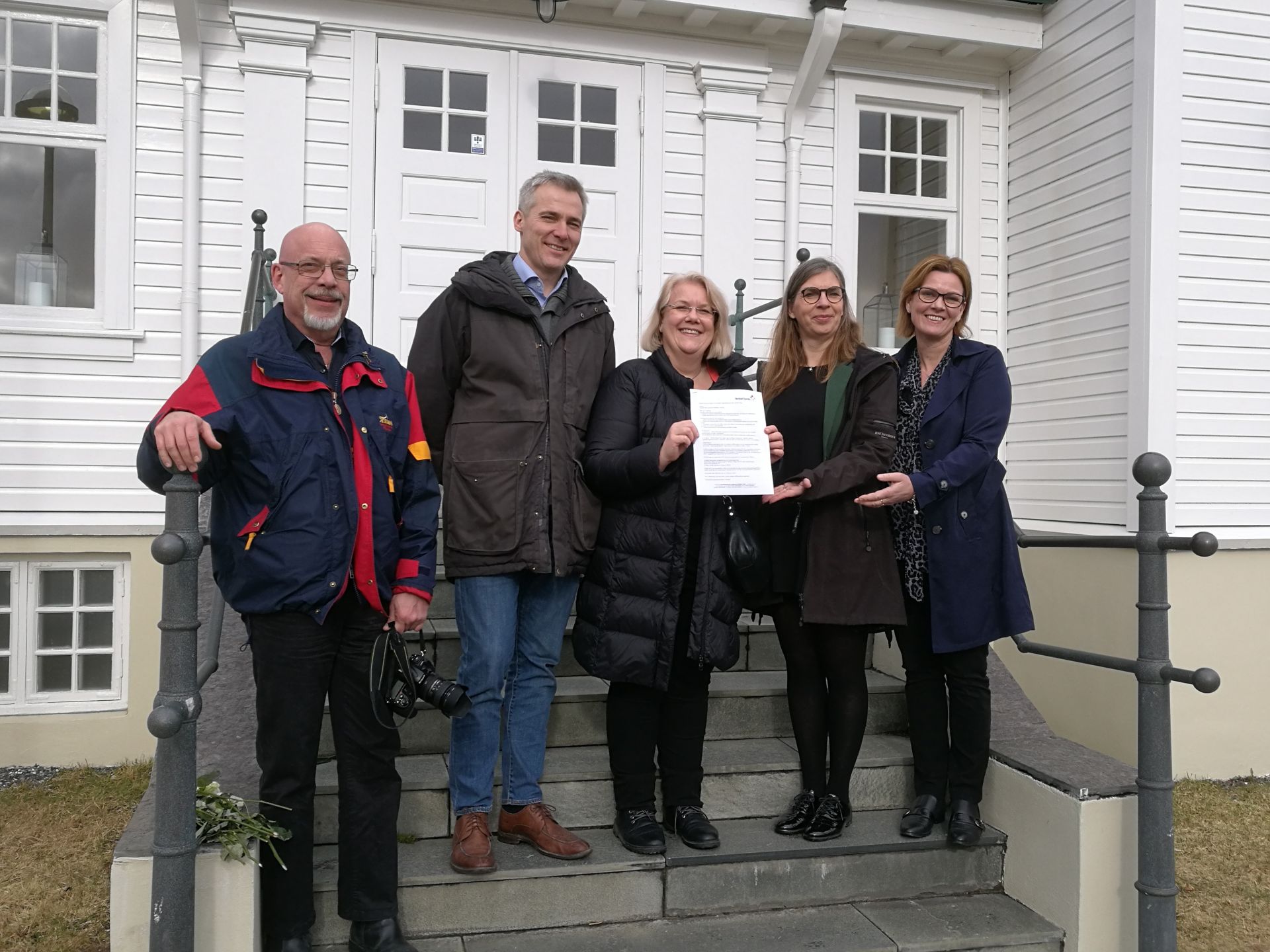 Ordförande i NoKo:s medlemsorganisationer med det nyss underskrivna samarbetsavtalet vid Husið Höfði i Reykjavik 19.3 2018. Från vänster Steven Lowenrud - SWE, Anders Adlercreutz- FIN, Gunn Iren Müller - NO, Mette With Hagensen - DK, Anna Margrét Sigurðardóttir - IS.